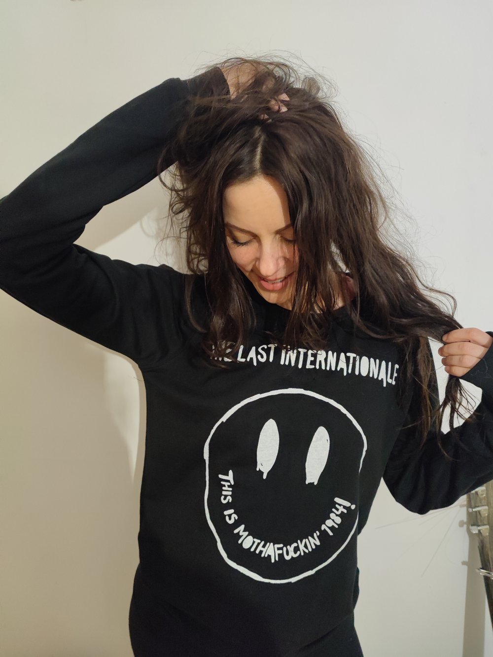 Screen printed by Edgey and Delila! 1984 Smiley face handmade design. Unisex 100% cotton crewneck sweatshirt. Screen printed by TLI!